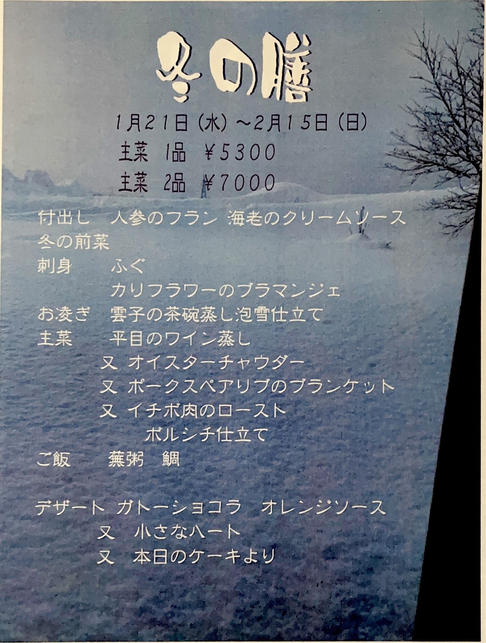 1月21日よりお支度します、冬の膳のメニューが出来上がりました。